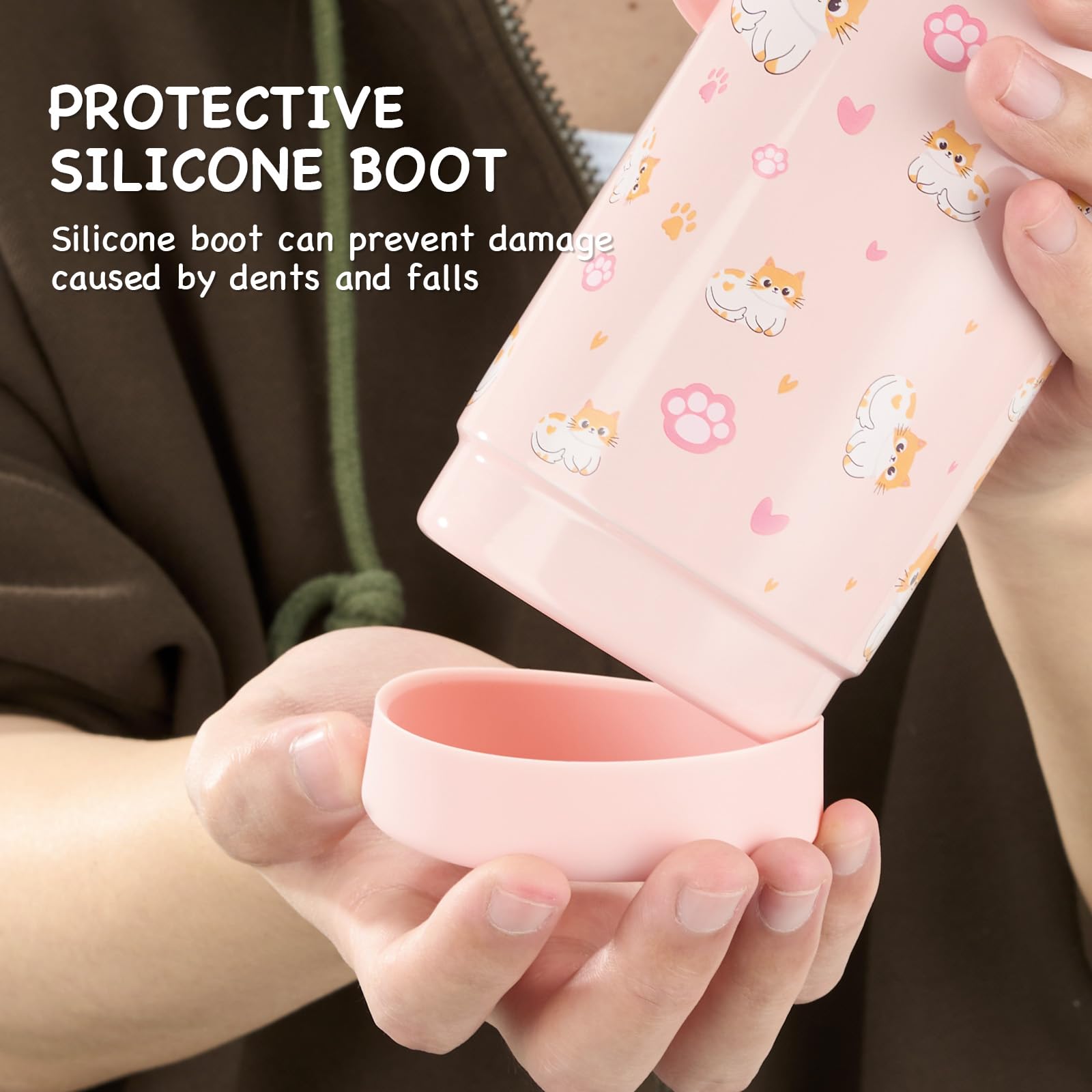 12 oz Kerilyn Kids Stainless Steel Insulated Water Bottle with Straw, Leak-Proof, BPA-Free, Kitty Design, Toddler Cup for School Boys & Girls
