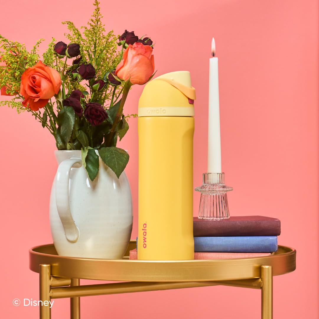Details: The Owala FreeSip Insulated Stainless-Steel Water Bottle with Locking Push-Button Lid easily tackles every thirst. With a built-in, easy-clean straw and a wide-mouth opening, the FreeSip reusable bottle is designed for drinking two different ways: sipping upright through the straw or tilting back to swig from the wide-mouth spout opening. Add in a push-to-open lid and Disney Princess themes, and staying hydrated has never been simpler—or more fun. Additional features include double-wall insulated stainless steel that keeps drinks cold up to 24 hours, a carry loop that doubles as a lock, a cup holder-friendly base, and a wide opening for easy cleaning and adding ice. The Owala FreeSip Insulated Stainless-Steel Water Bottle with Locking Push-Button Lid is available in five colors. Lid is dishwasher safe; hand wash cup. Not for use with hot liquids. Manufacturer’s limited lifetime warranty.
